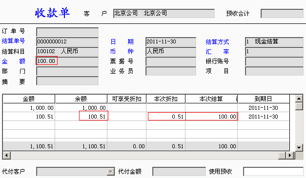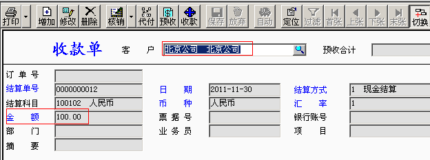 2、北京公司收到发票后送来货款,收到货款为100元整,已抹去零头部分;点击“销售管理”—“客户往来”—“收款结算”,增加一张100元的收款单
