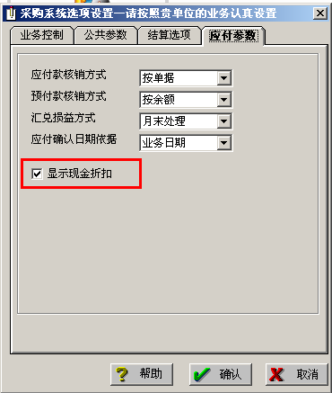1、点击“采购模块”—“业务范围设置”—“应付参数”,勾选“显示现金折扣”,勾选以后就会在“付款结算”中显示“可享受折扣”和“本次折扣”,并根据付款条件计算可享受的折扣。