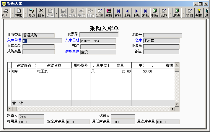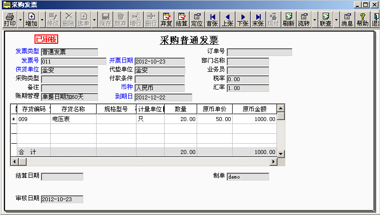 2、填制采购入库单流转生成采购发票并复核,数量20,单价50