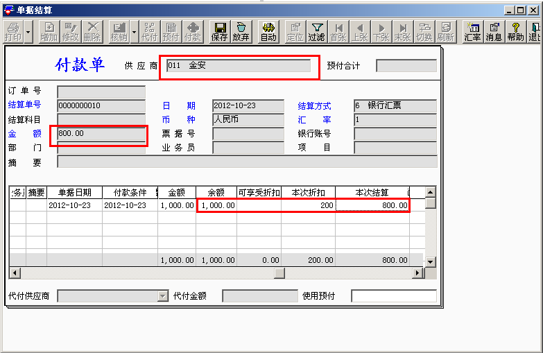 3、在付款单中填写本次实际付款金额800,核销时在表体中的“本次折扣”中填写200,则系统会自动算出“本次结算”金额为800元,点击“保存”后完成付款核销。
