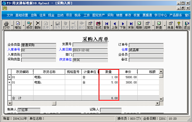 5、填制采购入库单,输入相关信息,点击“保存”,可以看到数量栏自动显示合计数