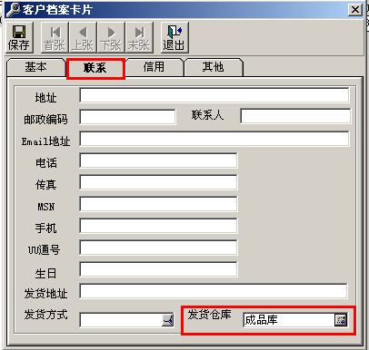 5、打开客户档案卡片,点击“联系”,在“发货仓库”中选择对应的仓库。