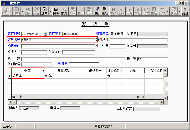 6、填制发货单选择该客户,在选中存货后,仓库会自动带出来。