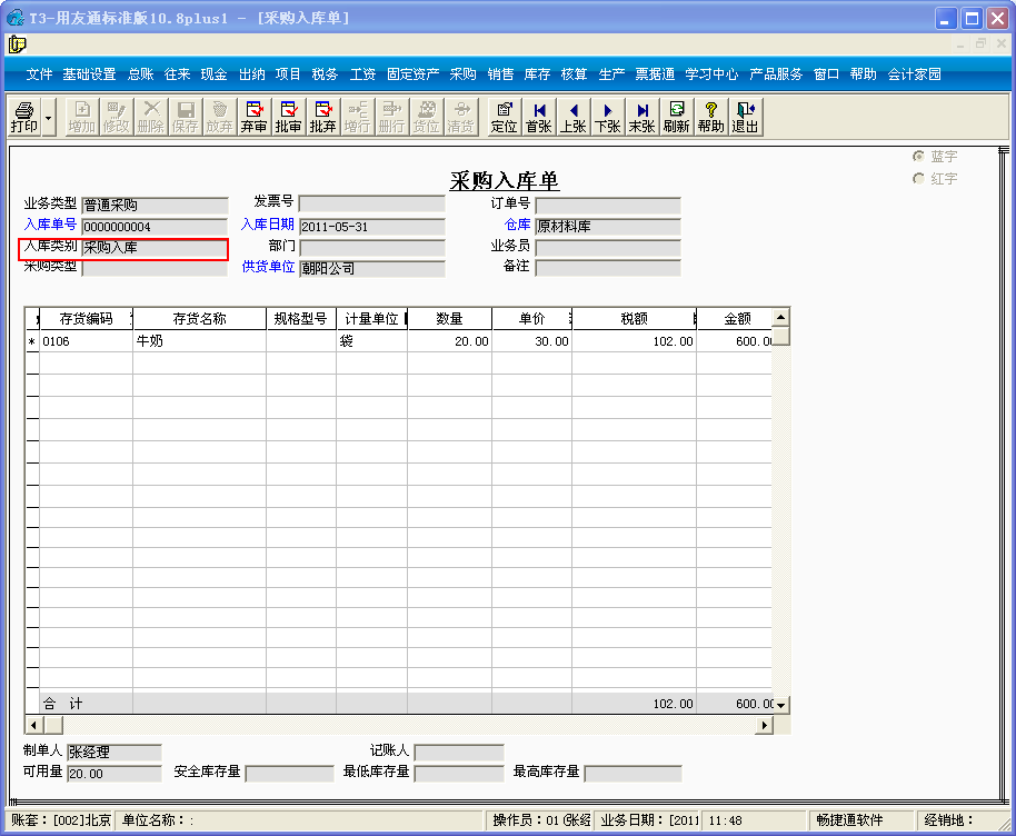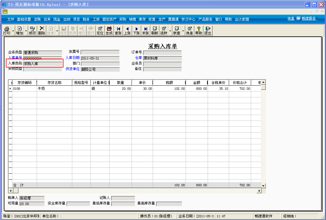 1、 点击采购管理-采购入库单,填制一张采购入库单;入库类别选择“采购入库”,仓库选择“原材料库”;