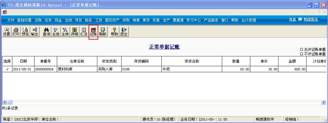 3、进入核算管理,点击“正常单据记账”,对采购入库单进入记账;