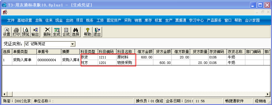 【问题现象】从 朝阳公司采购20箱牛奶,单价30元(不含税单价),这笔采购业务制单时在T3软件中如何设置自动带出科目?