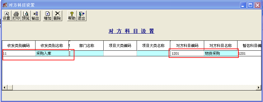 5、再依次点击“核算”-“科目设置”-“存货科目”,输入收发类别为“采购入库”,对方科目选择“物资采购”;