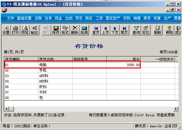 (2)在菜单栏里点击“销售”-“价格管理”—“存货价格”,输入电脑存货的报价2000。