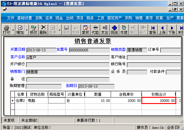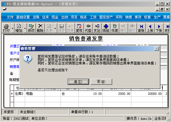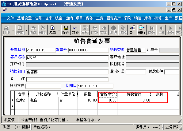 (3)填制一张销售普通发票,选择仓库和设置了存货价格的存货电脑之后再选择客户: