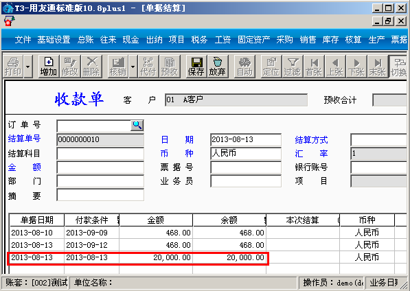 在销售模块点击“收款单”再点击客户方框的放大镜,选择客户后点击“增加”显示以下界面: