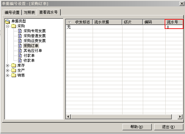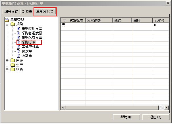 二、点击“查看流水号”-“采购”-“采购订单”。
