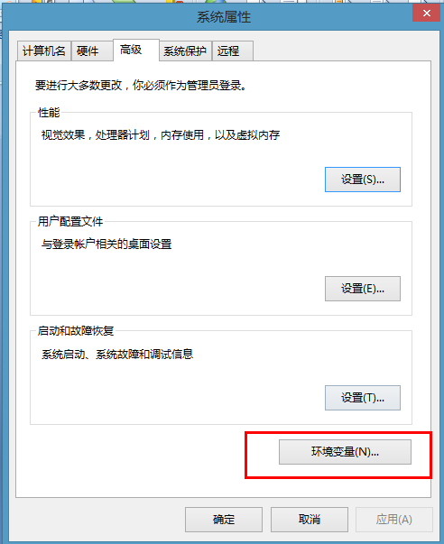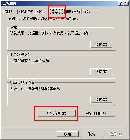 2、右击桌面上“我的电脑”的图标点“属性”,然后单击“高级”选项卡--点击“环境变量” 按钮: