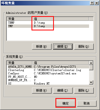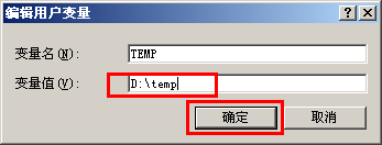 6、确定两个变量的值全部是“D:\temp”后点击“确定”退出: