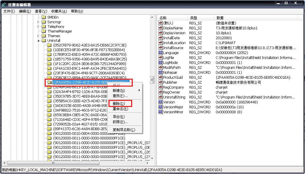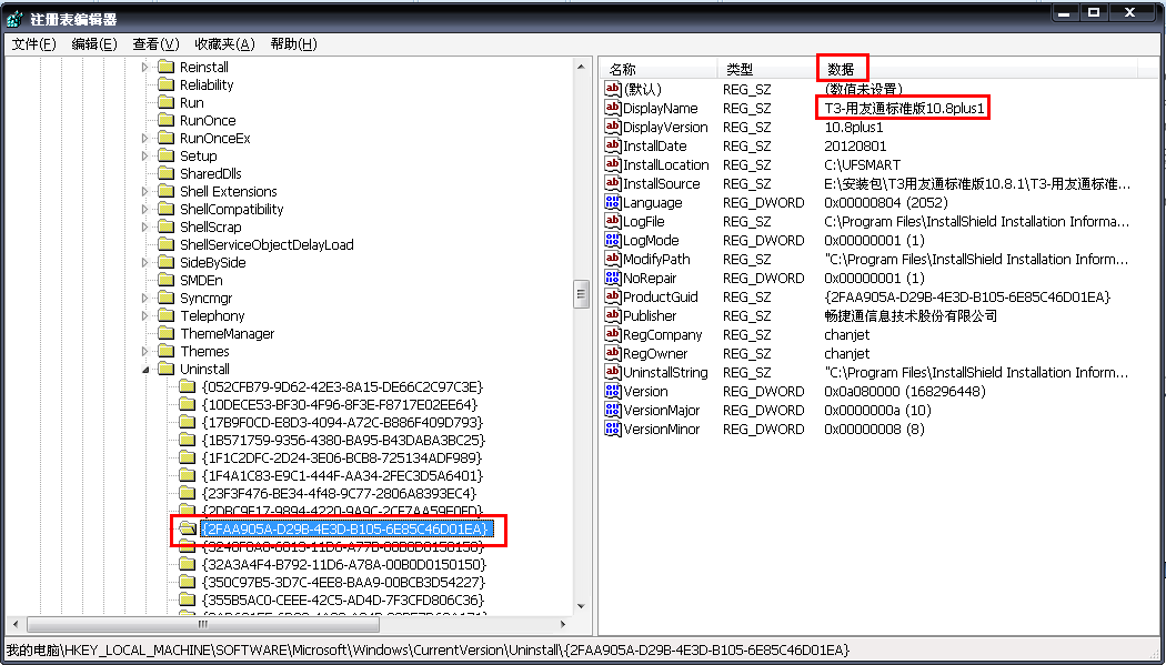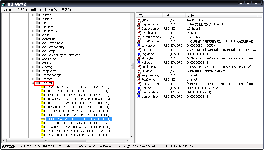e、依次单击Uninstall 下的文件夹,查看右边窗口数据栏下面是否有用友通标志。如下图所示: