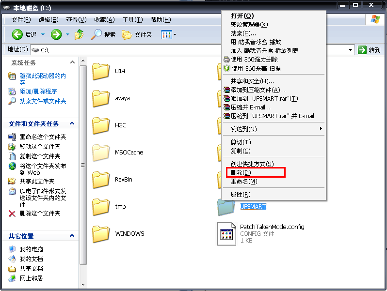 b、右击“UFSMART”文件夹,选择“删除”。如下图所示: