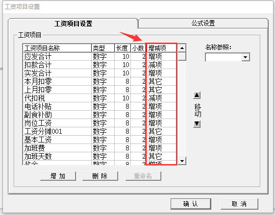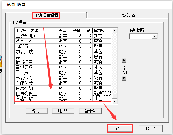 2.如需在公式设置中删除【高温补贴】项目,选中【工资项目设置】页签,找到【高温补贴】工资项目,将其【增减项】由【增项】修改为【其它】后,点击【确认】即可。