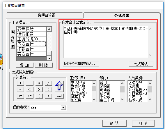 3.返回【公式设置】页签,查看【应发合计公式定义】,【高温补贴】工资项目自动被删除,同理,新增工资项目需要设置为【应发合计】公式,将其工资项目定义为【增项】即可。