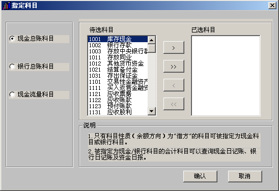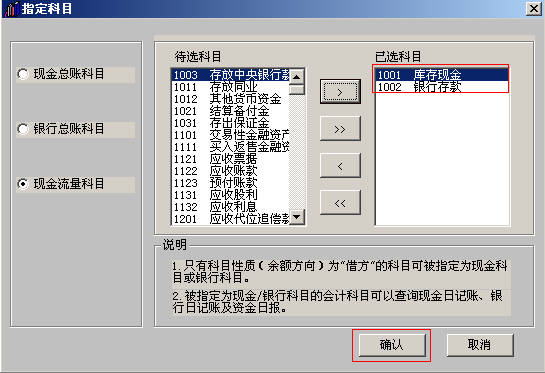 3.选中现金流量科目,将库存现金和银行存款设为现金流量科目的已选科目,点击确认。