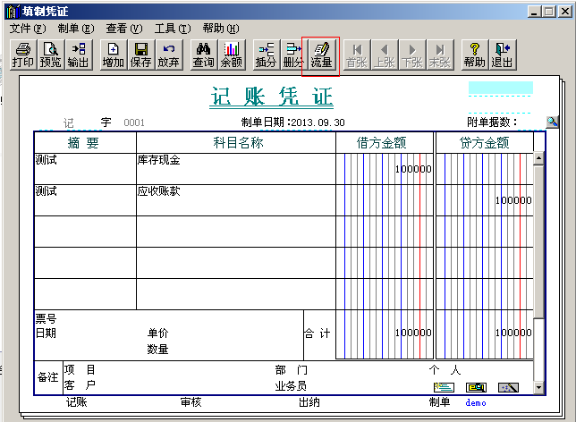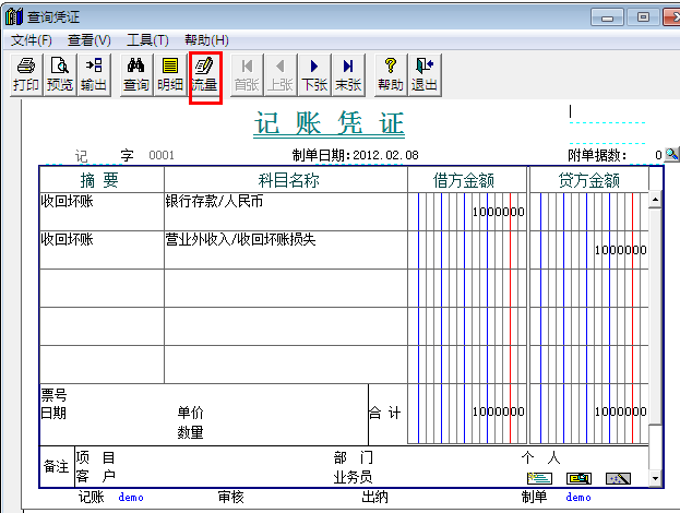 2.所查询出来的凭证都是关于现金流量科目的凭证,依次双击打开其中的凭证,点击上面的“流量”