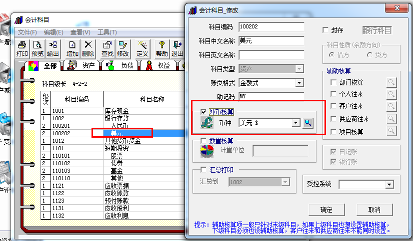 3.依次点击“基础设置”-“财务”-“会计科目”,对银行科目-美元加上“外币核算”:
