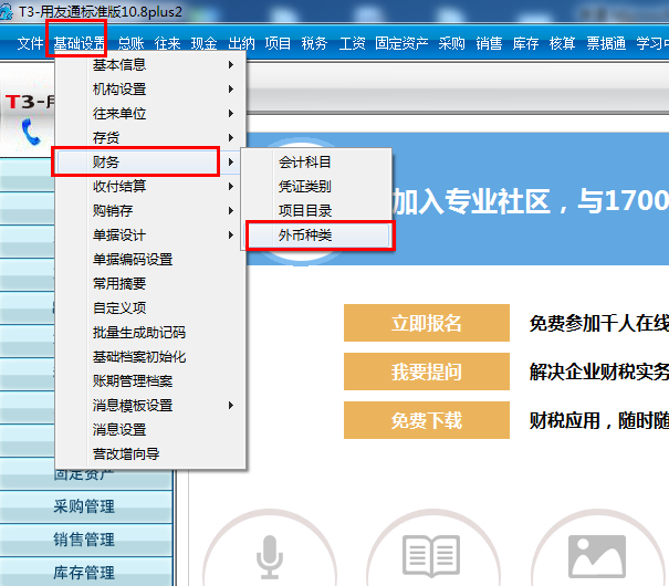 2. 依次点击“基础设置”-“财务”-“外币种类”,输入币符、币名和记账汇率(6.5):