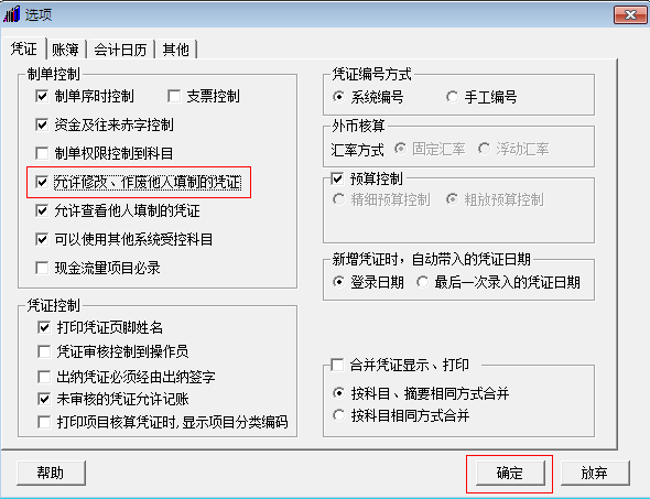 2.在选项中,查看凭证页签下“允许修改、作废他人填制的凭证”是否有勾选,如未勾选则将其勾选后点击确定。