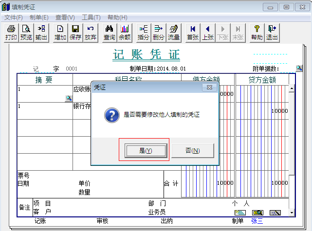 4.在弹出“是否需要修改他人填制的凭证”后,点击“是”。