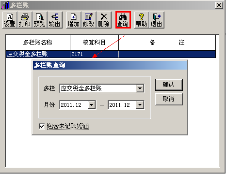 四、在多栏账界面点击“查询”,选择科目查看多栏账: