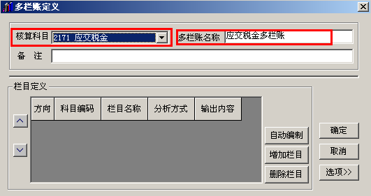 二、在“多栏账定义”的界面,选择核算科目,多栏账名称会自动出来,默认以科目名称命名,也可以修改: