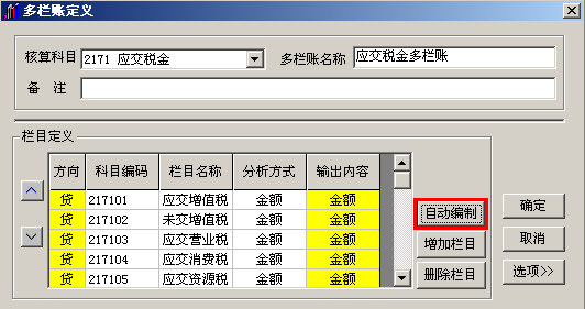 增加多栏账时的分析方式区别:若选按金额分析,则系统只输出其分析方向上的发生额;若选按余额分析,则系统对其分析方向上的发生额按正数输出,其相反发生额按负数输出。如:11901科目为借方分析,若选择金额方式,系统只输出其借方发生额;若选择余额方式,系统将其借方发生额按正数输出,其贷方发生额按负数输出。
