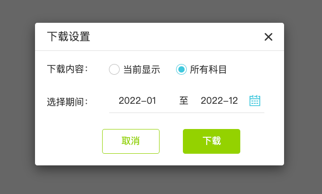 在弹出的界面中,【下载内容】可以选择【当前显示】或【所有科目】,需要所有科目都需下载,则选【所有科目】;同时也可点击【选择期间】进行下载: