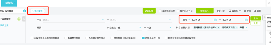 2、新版下载:依次点击【总账】-【明细账】,点击右上角升级新版,再次点击【展开更多】,选择科目起止、期间全年和科目级次1-6,进行查询后,点击右上角导出。