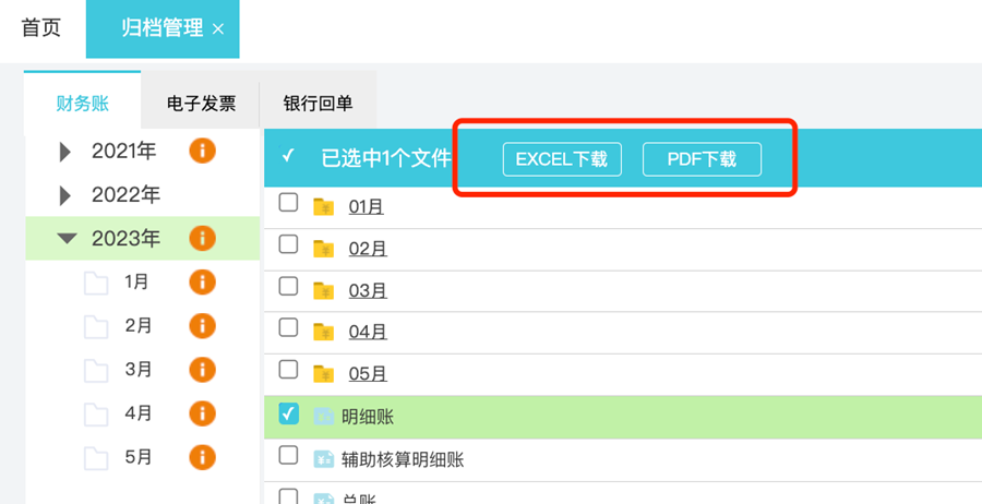 3、批量下载:点击【归档管理】,在左侧选择归档的年份,点击右上角【归档】,稍等片刻,然后左侧选择年度或月份,勾选明细账,点击【Excel下载】或【PDF下载】即可: