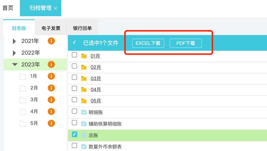2、批量下载:依次点击【归档管理】,左边选择对应年或者月份, 点击右上角【归档】,选中总账后点击【Excel下载】或【PDF下载】即可: