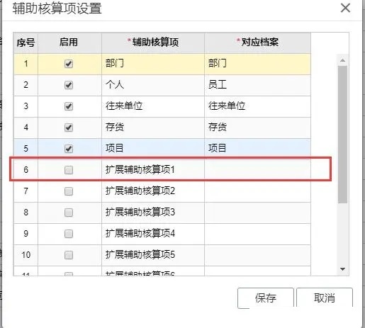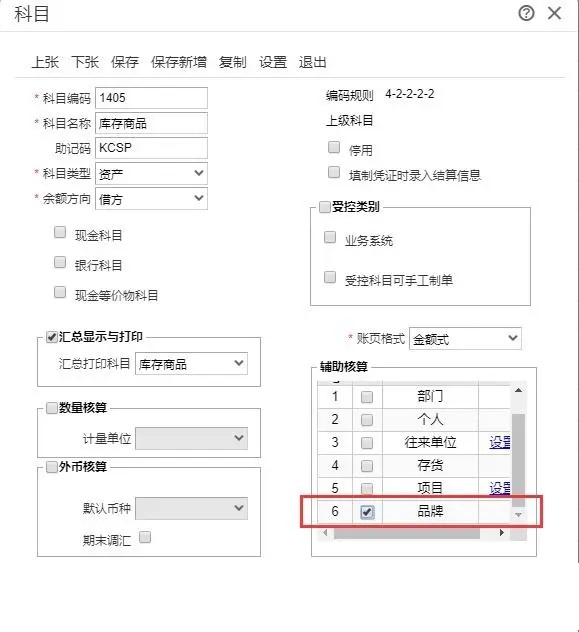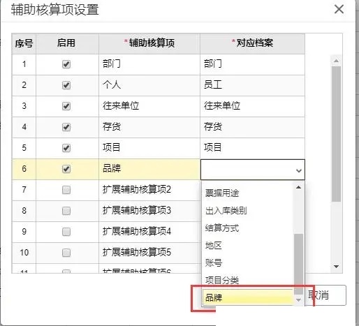 2.勾选‘扩展辅助核算项1’,名称改为‘品牌’,对应档案选择品牌