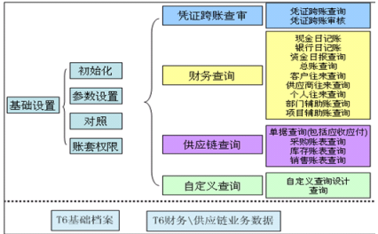 跨账套查询的功能分为四个部份:凭证跨账查审、财务查询、供应链查询、自定义查询,通过以上各查询功能实现多组织或多业务账套应用的数据查询处理。