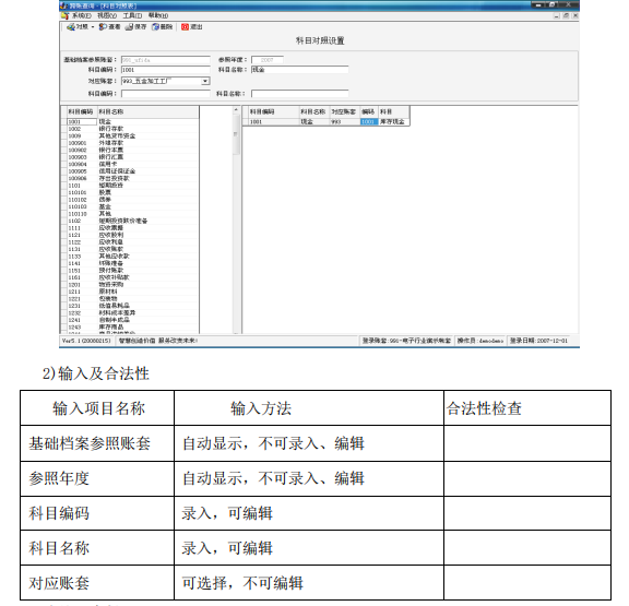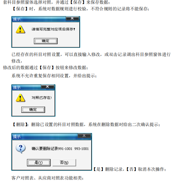 【是】进行对照,【否】取消本次操作;【查看】:查看已经存在的科目对照设置数据,查看时【对应账套】为必选项,如果【对应账套】未选择,则【查看】无反应;【保存】:系统除支持科目按编码对照、名称对照二种自动对照方式同时,还支持手工进行科目对照的设置,进行手工科目对照设置时,可直接点选左侧“基础档案参照账套“中已存在的科目记录,然后手工增加对应账套的科目信息,或者通过双击“基础档案参照账套“中存在的科目记录,系统将显示对应账套的科目参照窗体,直接通过对应账