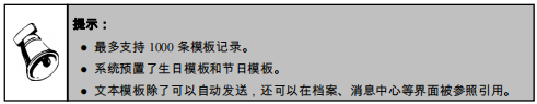 本功能主要用于自动发送文本信息的模板设置,包括文本、生日和节日模板,例如通过设置自动模板,可以向客户、供应商以及员工等自动发送生日和节日祝福;文本模板也可以在档案、消息中心等界面被参照引用。