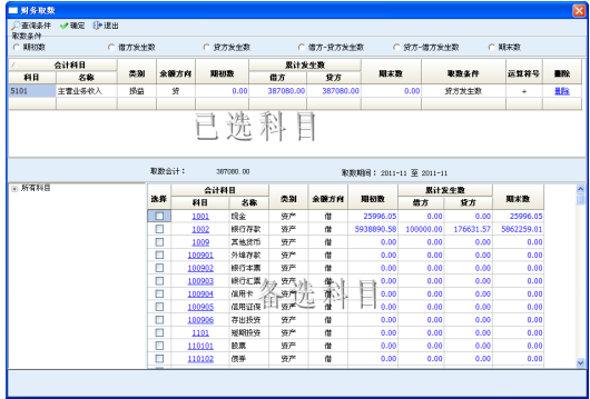  分上下两部分:上部分为已选会计科目,选择取数条件、运算符号,点击“确定”将计算结果返回单元格,可删除;下部分为备选会计科目,勾选后为已选会计科目;“期间”选择取数期间;