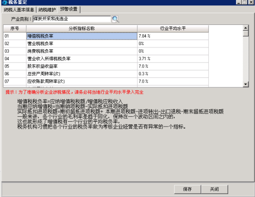 用户可以根据产业类别选择,由系统自动带出各分析指标的预警值,也可根据当地行业平均水平修改。在线状态下打开税务坚定信息,程序会自动检索更新最新的行业预警值,确保更好的对本企业进行财务、税务状况进行分析。