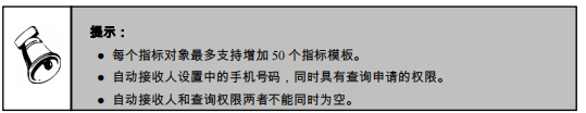 自动接收人:系统根据发送时机主动向自动接收人设置的手机号码发送指标编码对应的查询结果。