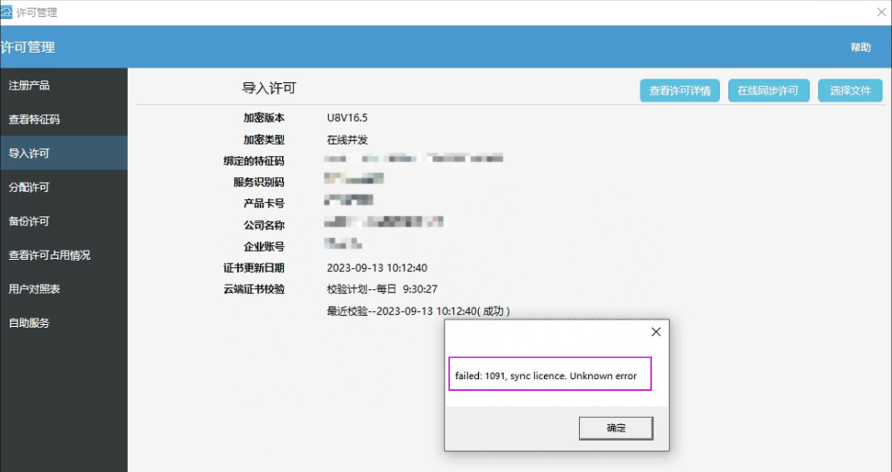 用友U8+V16.5许可管理--导入许可--在线同步许可报错提示“failed 1091,sync license unknown error” 如下图所示:
