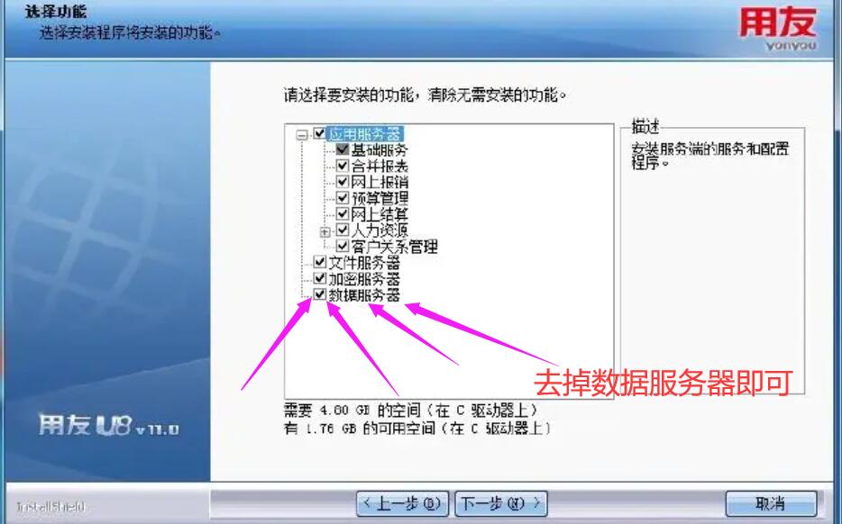 2、选择服务器或自定义后,选择应用服务器,安装过程中,不选择“数据服务器”即可,如下图箭头所示