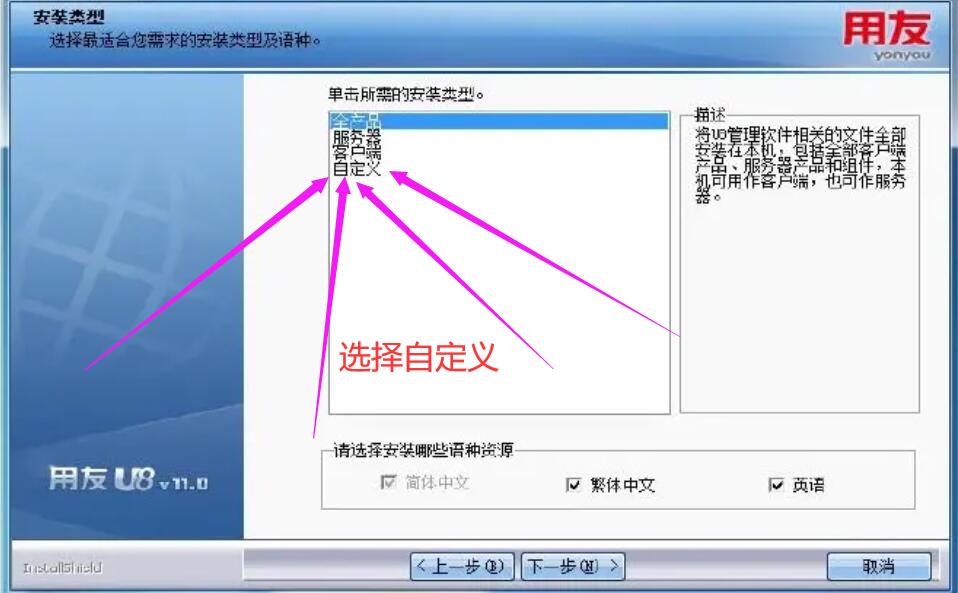1、到选择安装类型这一步,选择自定义类型;如下图所示(也可以选择服务器)