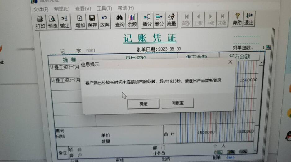 用友畅捷通T3客户反馈:他安装的用友T3在录入凭证的时候提示‘客户端已经较长时间未连接加密服务器,超时1933秒,请退出产品重新登录’ 如下图所示