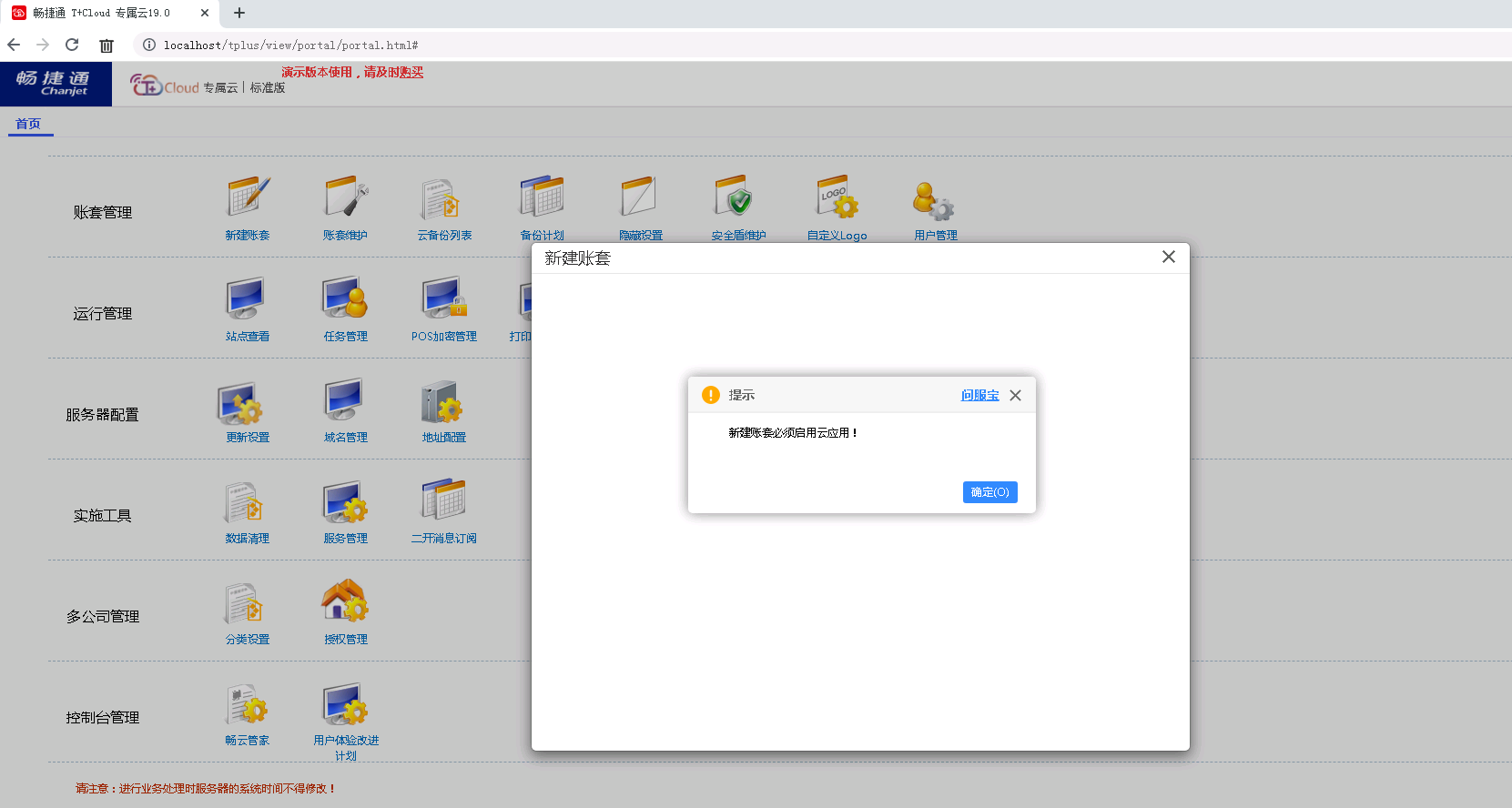 5、创建个账套,“新建账套必须启用云应用” 如下图所示;