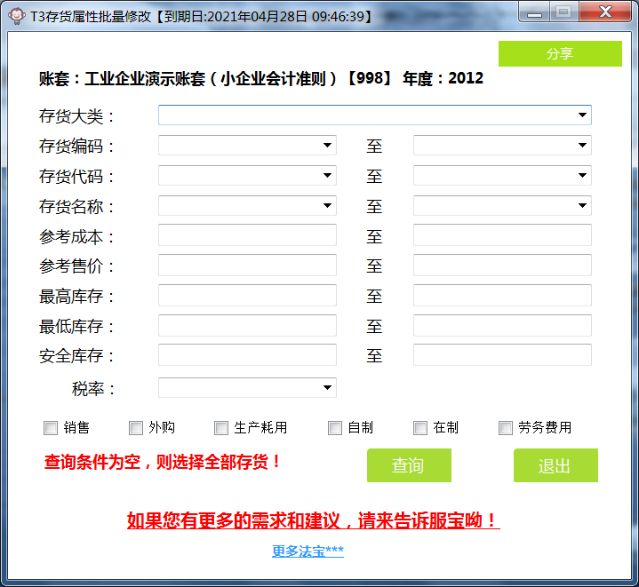 再多的存货,修改属性也只需要一次。选中要修改的档案,一键批量修改。尤其适合多库存的企业,成百上千种存货无须一个一个手工修改,一次批量修改完成。
