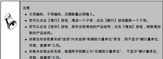 用来定义产品结构,即产品的组成,以便用于配比出库、消耗定额、产品材料成本、采购计划、成本核算等引用。产品结构中引用的物料必须首先在存货档案中定义,然后才能在产品结构中引用。有多级结构的产品需要一级一级输入。比如计算机由显示器、主机、键盘、鼠标组成;主机由机箱、软驱、硬盘、主板、CPU 等组成。假设在存货档案中已经定义好这些物料的编号、名称、规格型号等。输入产品结构时需要先输入计算机的下一层结构,然后输入主机的下一层结构。用户双击基础设置中的【产品结构】项进行设置。