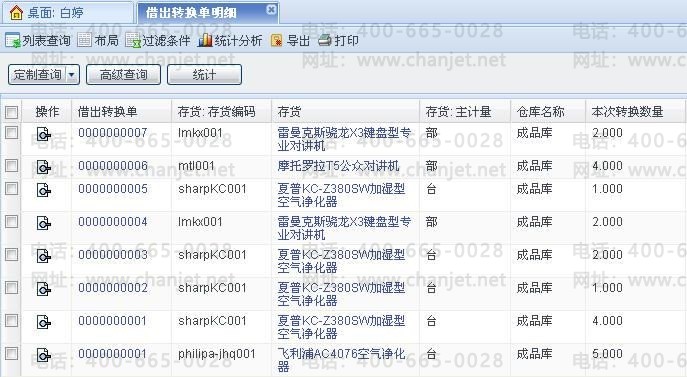  [统计分析]:点击后弹出借出转换单和借出转换单明细选择菜单,统计分析借出转换单及借出转换单明细信息。