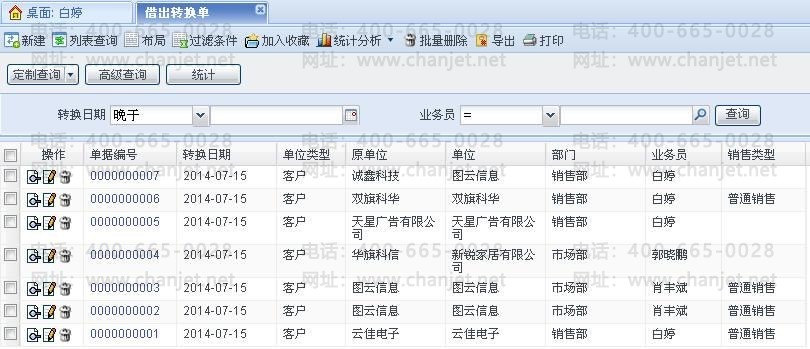 前台系统中,通过菜单借出管理借出转换单,进入借出转换单的列表页面。可在列表页面对借出转换单做相应的操作,如新建、查询、查看、编辑、删除、批量删除、统计分析、加入收藏、导出、打印等操作。